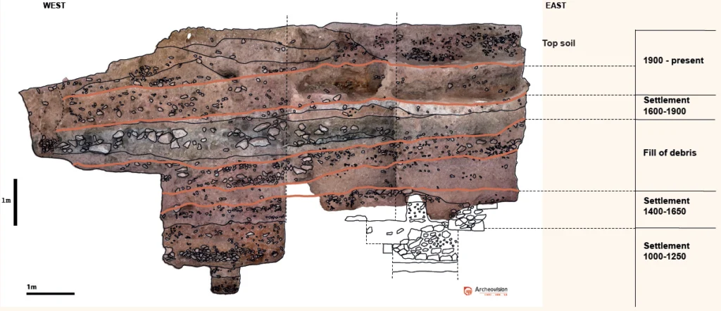 Dégager cette tranchée avait un double intérêt. Il s’agissait d’une part de restituer un aspect du site longtemps oublié du fait de la sédimentation et de mettre en évidence des tranchées sur la partie haute du site. D’autre part, alors que pour toutes les autres tranchées dégagées, l’information archéologique a été perdue, l’idée était de procéder à une fouille stratigraphique en enregistrant les informations : le remplissage des tranchées est-il naturel, quels types d’artéfacts sont retrouvés, pour finalement tenter d’appréhender la fonction de la tranchée d’Adish-Adie ?