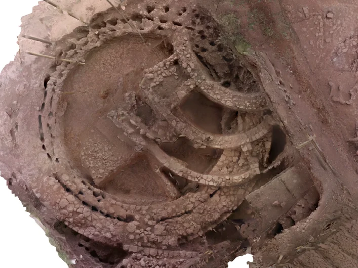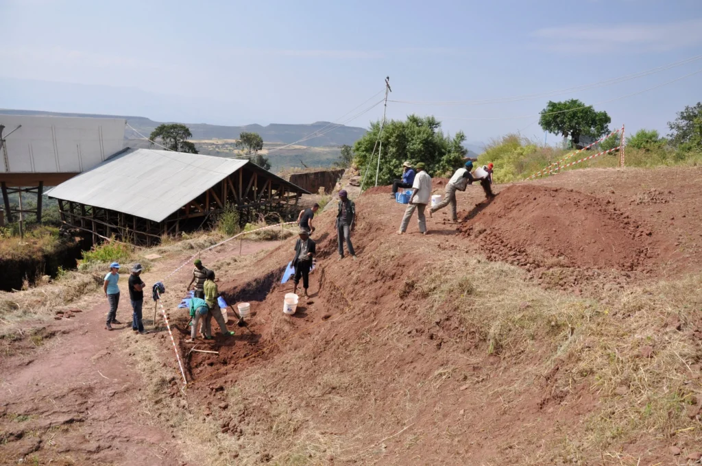 Les premiers sondages archéologiques à la périphérie de ce site ont permis de mettre en évidence un mur monumental construit en pierres de taille et daté par C14. La datation au Carbone 14 est une méthode scientifique utilisée pour déterminer l’âge des matériaux organiques en mesurant la quantité de carbone 14 (un isotope radioactif qui se désintègre à un rythme constant) entre mi-10e et mi-11e siècle. En partie éboulé, certains modules sont aujourd’hui visibles sur le chemin menant à l’église de Gabriel-Rufael. Les fouilles se sont ensuite concentrées sur un autre versant de la colline, faisant face à l’église de Merqorewos. En partant du chemin qui permet de circuler entre les différentes églises de cette partie du site, les travaux ont consisté à attaquer de front la colline de déblais. Une structure circulaire, creusée dans la roche, s’est alors dessinée sous les yeux des archéologues. Les dates C14 ont permis d’attribuer ces aménagements à une période allant du milieu du 11e au milieu du 12e siècle, soit quelques décennies en amont du règne de Lalibela (ca. 1204-1225). Après avoir obtenu l’aval des autorités et des habitants de Lalibela pour ne pas reboucher le site de fouille, les excavations ont été poursuivies et agrandies, en partant cette fois-ci du sommet de la colline pour mettre au jour les différents niveaux stratigraphiques.