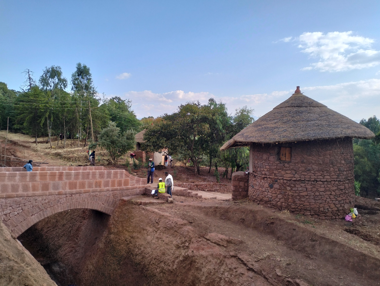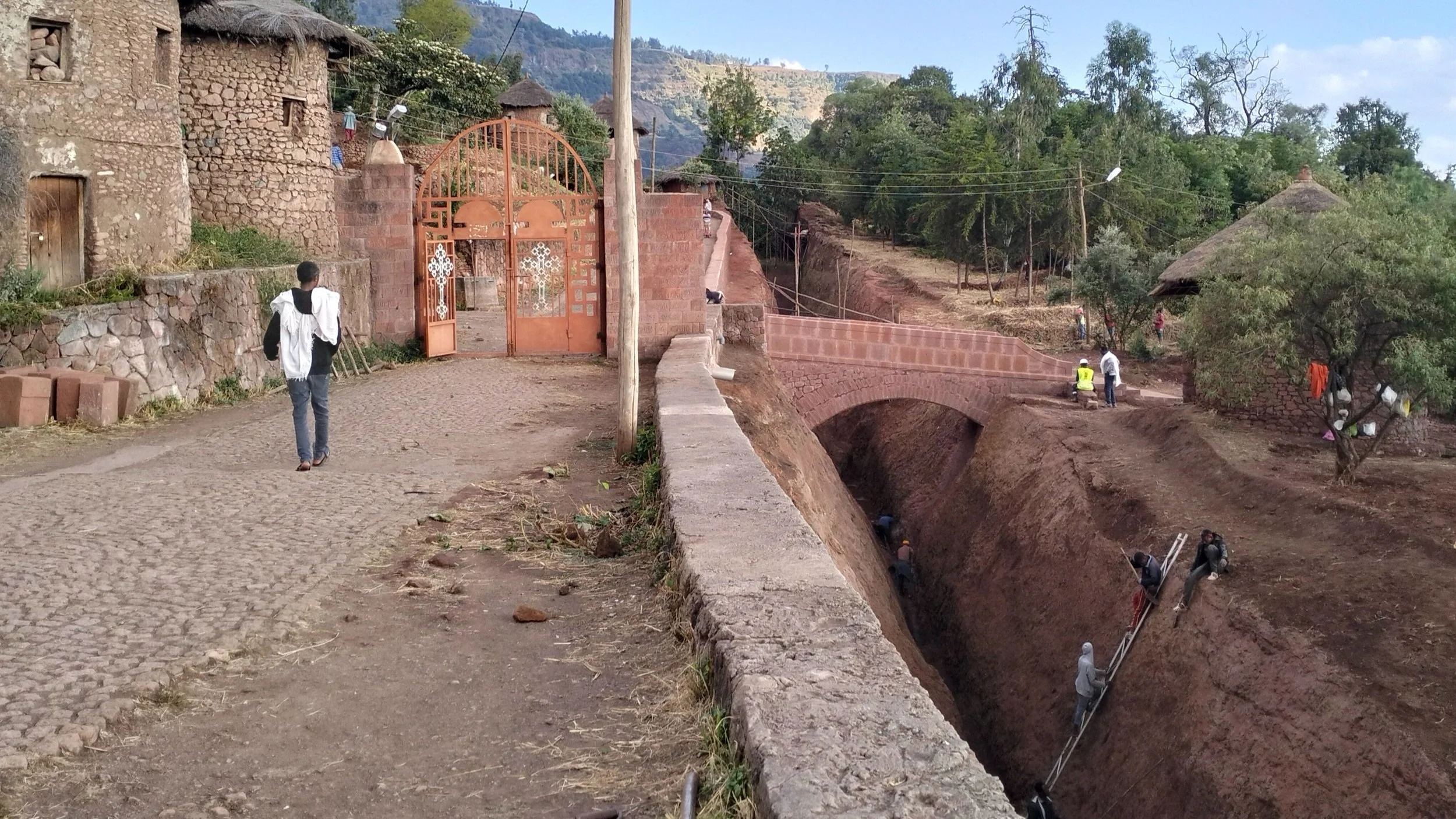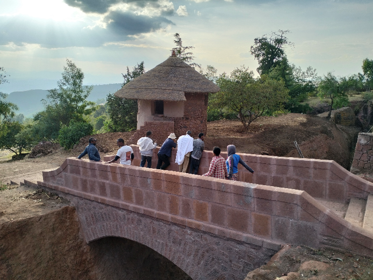 Tout en haut des églises de Lalibela, sur le chemin qui longe les deux groupes de monuments d’un côté et l’ancien quartier d’Adish-Adie de l’autre, un nouveau pont de pierre vient tout juste d’être érigé. Sa construction s’est imposée quand l’une des tranchées monumentales du site a été vidée, coupant ainsi l’un des accès entre le haut de la ville et sa partie basse. Le dégagement de cette tranchée entre dans un programme archéologique et paysager visant à restituer le système des tranchées anciennement creusées sur le site, pour mieux saisir leurs fonctions. Ces travaux ont été menés sous supervision d’une équipe d’archéologues et les résultats de ces travaux feront l’objet d’un prochain bulletin.